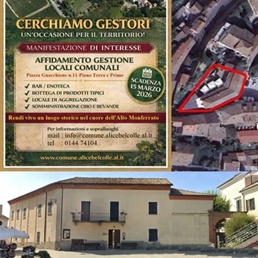Il Comune di Alice Bel Colle con il presente avviso rende noto che intende acquisire manifestazioni di interesse finalizzate ad un eventuale affidamento della gestione dei locali di proprietà comunale siti in Piazza Guacchione n.11– piano terra e primo piano.