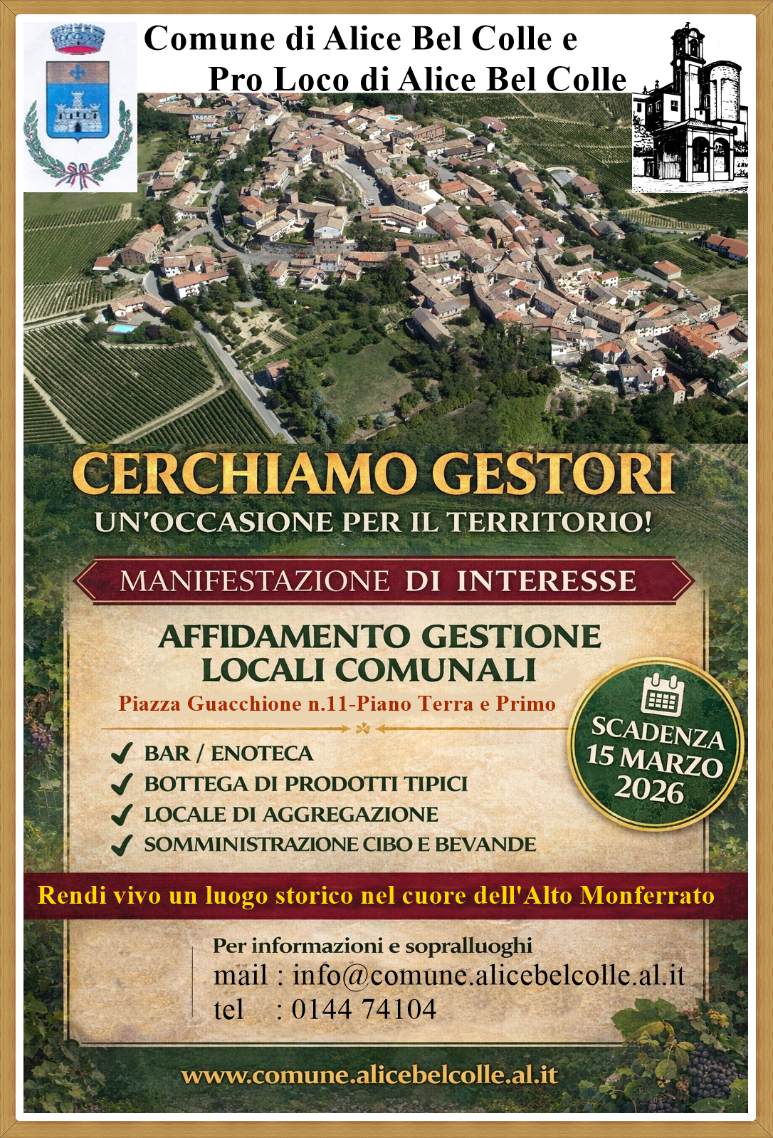 Il Comune di Alice Bel Colle con il presente avviso rende noto che intende acquisire manifestazioni di interesse finalizzate ad un eventuale affidamento della gestione dei locali di proprietà comunale siti in Piazza Guacchione n.11– piano terra e primo piano.